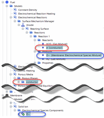 Since electrons can exist in different continua, take care to select electrons from the correct location.When using the Porous Media model, you select the electrons from the solid porous phase that is in the same continuum as the reaction (this defines the porous phase as the conductor or binder), and electrochemical species from the Solid Ion model in the interfacing continuum or ions from the Multi-Component Liquid when the Concentrated Electrolyte Model is present (this defines the interfacing continuum as the electrolyte).