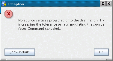 在本实例中,尝试撤消对源和目标的面或边进行的选择。在面或边相隔距离较大的情况下,随着容差值的增加,对各项进行更精细的三角形化可改善合并效果。