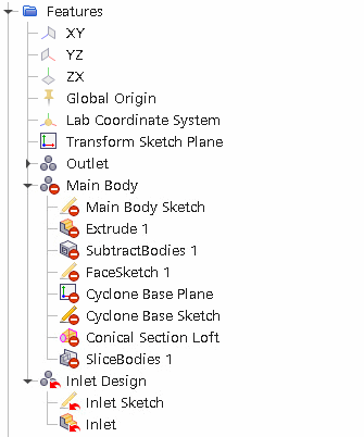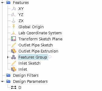 使用 3D-CAD 可以将特征分组到一起,从而在模拟树中组织这些特征。使用此功能可以缩小特征设计树的长度,从而轻松访问各个组成部分。