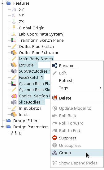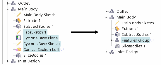 在 3D-CAD 模拟树中选择要分组的特征。要选择多个特征,在按住 <CTRL> 键的同时进行选择。