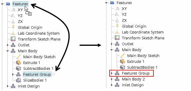 - 要从组中移除特征,右键单击特征组节点,然后选择取消组合。