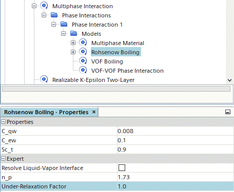 因沸腾而产生的壁面热通量是壁面边界的高度非线性函数,其中壁面温度是数值求解的一部分。例如,给定的热通量壁面边界或固液交界面。在这些情况下,为了改进收敛,可降低沸腾产生的热通量的亚松弛因子值(Rohsenow 沸腾节点中的亚松弛因子属性)。