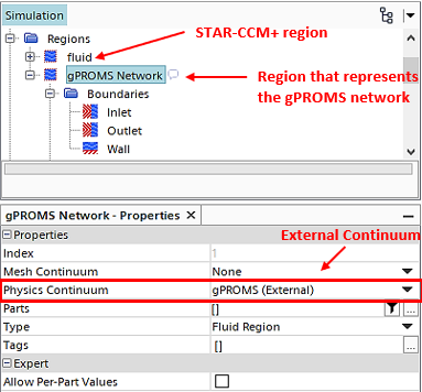 要将数据导出至 gPROMS,需要一个表示 Simcenter STAR-CCM+ 模拟中的外部 gPROMS 网络的区域。此区域与外部物理连续体相关联。