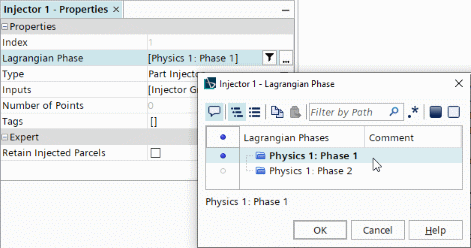 要将拉格朗日相分配给喷射器,选择喷射器节点并从拉格朗日相属性的对话框中选择该相。该对话框使用动态查询,因此可以通过附加的标记选择相。
