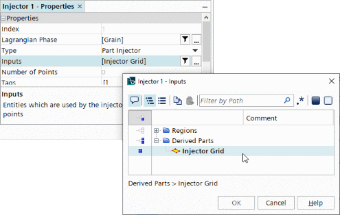 要分配喷射器的输入零部件,单击喷射器节点的输入属性的右半部分。此操作将激活输入对话框,该对话框使用动态查询。
