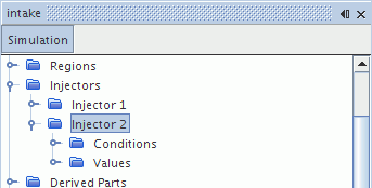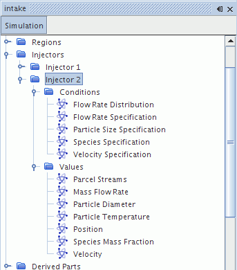 每个喷射器均包含若干子节点,这些子节点是喷射器条件和值的管理器,其作用类似于 Simcenter STAR-CCM+ 模拟的条件和值。