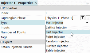 喷射器具有类型,这可确定喷射点的生成方式。颗粒将在这些喷射点处引入,并分配给用户指定的拉格朗日相。