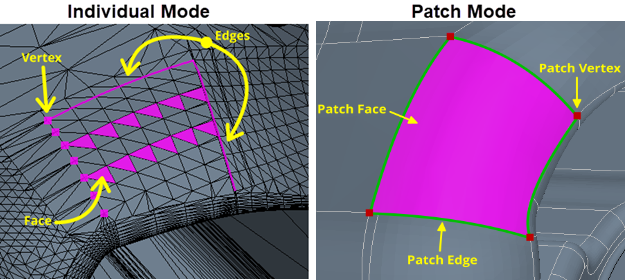 借助表面修复工具,可以根据网格化中的单个三角形或 CAD 几何中的基础块定义来选择面。有几种方法可用于根据连续性和接近度来快速进行选择。