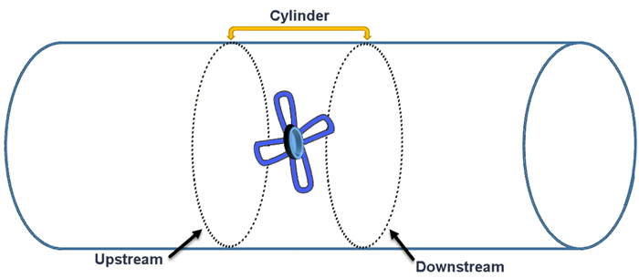 将圆柱体的表面重命名为 [上游] 和 [下游],具体视流向而定。为区域分配零部件时,这些表面形成静态和旋转区域之间的交界面。请参见下图: