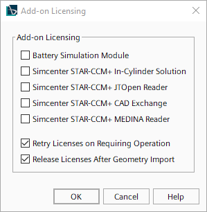重试所需操作许可证选项控制 Simcenter STAR-CCM+ 是否尝试分配所需的许可证(如果尚未分配)。如果清除此选项,则 Simcenter STAR-CCM+ 不会尝试和分配任何附加许可证。