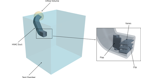 恒密度为 1.18415 kg/m^3 的空气流经 HVAC 管道进气口。在管道末端,三个叶片、一个阀瓣、一个夹子和一个调整器用于在气流进入测试室之前对其进行控制。此设置不针对任何特定几何,通过设置模拟模板中的条件,可以快速导入任何 HVAC 管道几何,并将标签和参数调整到新几何。