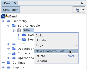 创建几何零部件 使用 3D-CAD 模型创建一个新的几何零部件。使用以下步骤: 右键单击几何 > 3D-CAD 模型 > S-Bend(S 形弯管) 节点,然后选择新建几何零部件。 此时将显示零部件创建选项对话框。 单击确定接受默认设置。 要查看表面,请展开零部件 > 流体 > 表面节点。 指定入口面和出口面中的入口面和出口面定义为独立的表面。