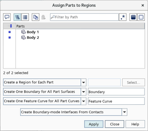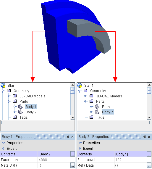 几何部件具有接触属性,该属性提供与该部件接触的其他所有部件的列表。此部件接触数据可用于自动为网格和物理耦合生成交界面,而无需手动创建和分配重合面。