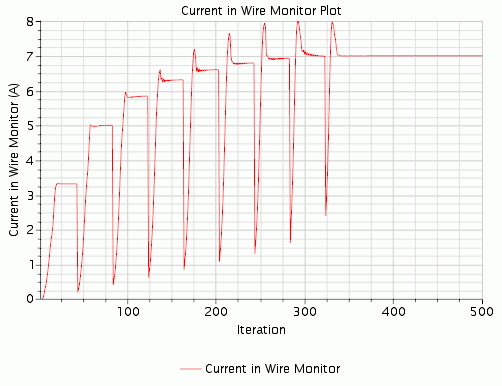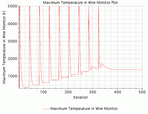 报告绘图 以 x-y 绘图的形式可视化熔丝中的电流和最高温度。 可视化绘图: 单击图形窗口顶部的 Current in Wire 监视器绘图选项卡。 场景如下所示 单击图形窗口顶部的 Maximum Temperature 监视器绘图选项卡。 与下图所示场景类似的场景随即出现