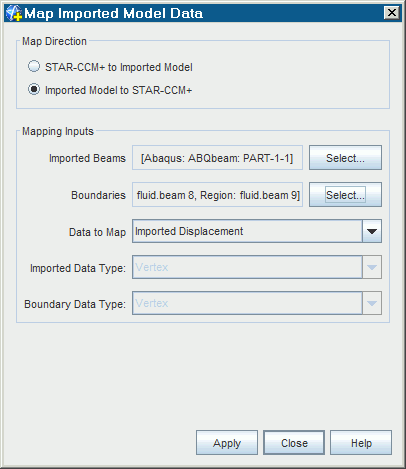 - 在映射输入框中,选择要用作映射源的导入的模型梁以及要映射到的 Simcenter STAR-CCM+ 边界。