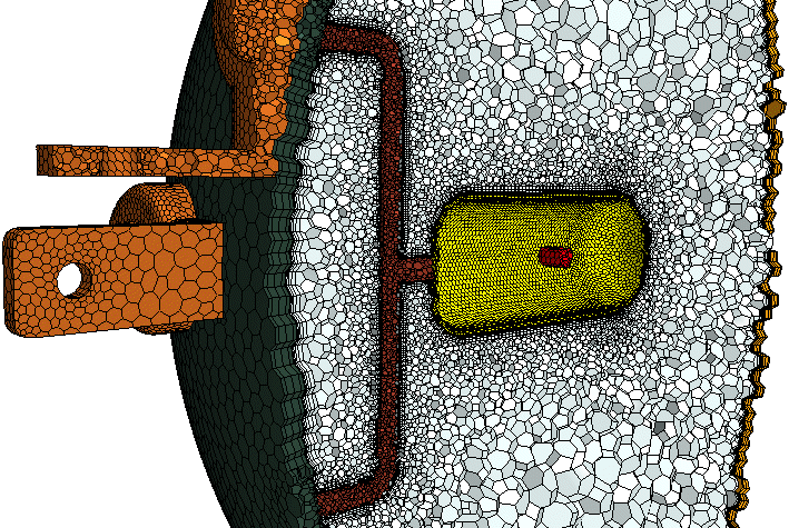 To allow for conjugate heat transfer without interpolation on the walls, the mesh is set up to use the polyhedral mesher. To improve accuracy of the flow solution, the prism layer mesher generates orthogonal prismatic cells next to all wall surfaces in the air domain. For thin solid components, such as the halogen bulb, the rear housing, and the lens, the thin mesher generates a prismatic type volume mesh. Surfaces with a high photon emission, such as the lamp filament, are resolved with a fine mesh. No volume mesh is generated for the gas inside the halogen bulb. - Save the simulation as headlamp_run.sim.