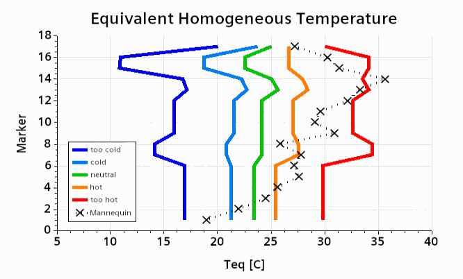 y 轴描述标记指的是体段指数。下表列出哪些体段属于哪个指数:标记/段指数 体段 1 R_Foot 2 L_Foot 3 R_Calf 4 L_Calf 5 R_Thigh 6 L_Thigh 7 R_Hand 8 L_Hand 9 R_Forearm 10 L_Forearm 11 R_Arm 12 L_Arm 13 Thorax_Back_and_Shoulder 14 Thorax_Front 15 Face_and_Neck 16 头部 17 Abdomen_and_Pelvis 在绘图中,彩色线表示 DIN EN ISO 14505 热舒适性的标准数据。这些数据是通过测量受各种热条件影响的人获得的。预测的等效均匀温度由黑色点线给出。等效均匀温度是评估人在特定环境中热舒适性的局部度量。