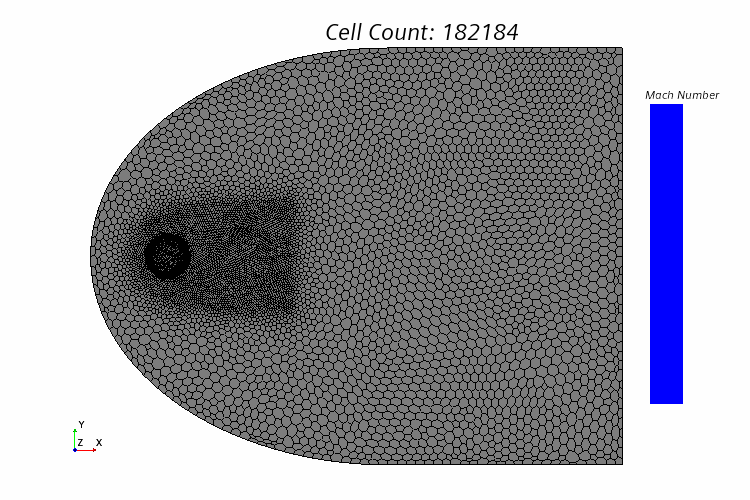 要在极超音速流中可视化激波,可在绘制马赫数的区域内创建一个标量场景。该标量场景中可以添加一个网格单元计数注释作为网格自适应的指示器。