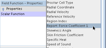 例如,当添加名为 Force Coefficient 1(力系数 1) 的报告时,具有场函数选择的下拉列表(无论用于何处)将包含一个名为 Report: Force Coefficient 1(报告:力系数 1) 的项。