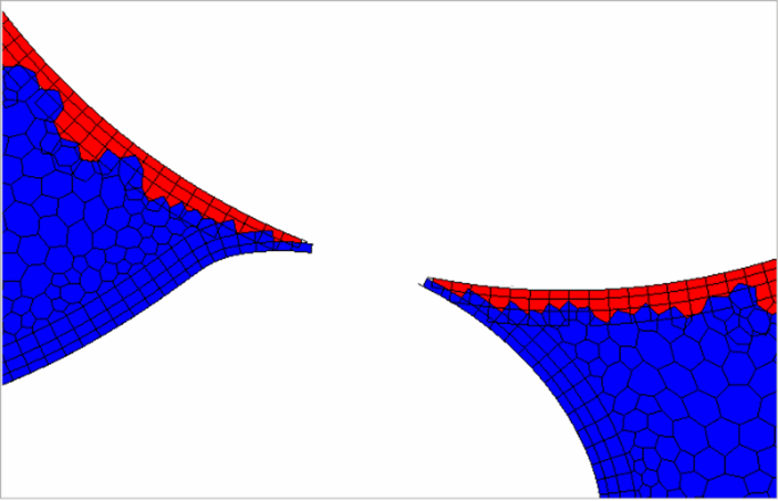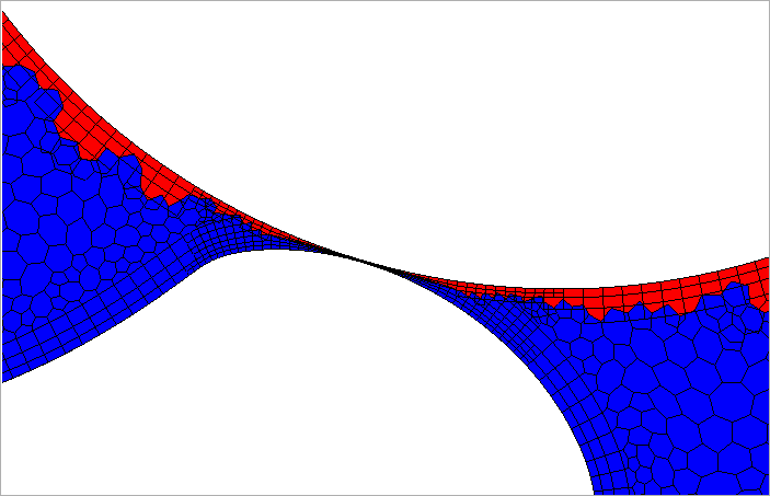 为了获得足够的网格单元数来求解穿过间隙区域的流体,通常需要执行加密。如果间隙区域被重叠交界面包围,则壁面边界之间可能会出现空隙。示例如下所示: