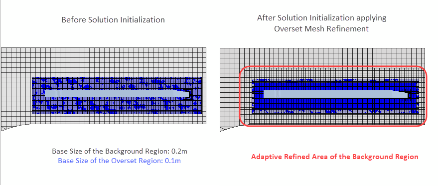 在有一个背景区域和一个重叠区域的情况下,背景区域的网格单元会根据重叠区域的网格单元进行加密或粗化。应用重叠网格细化有助于确保在重叠网格交界面上成功插值。示例如下所示: