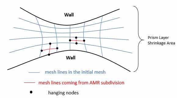 在重叠模型中使用棱柱层收缩时,收缩区域中必须始终具有均匀的网格单元密度。悬挂节点无法由棱柱层收缩模型处理,如下图所示: