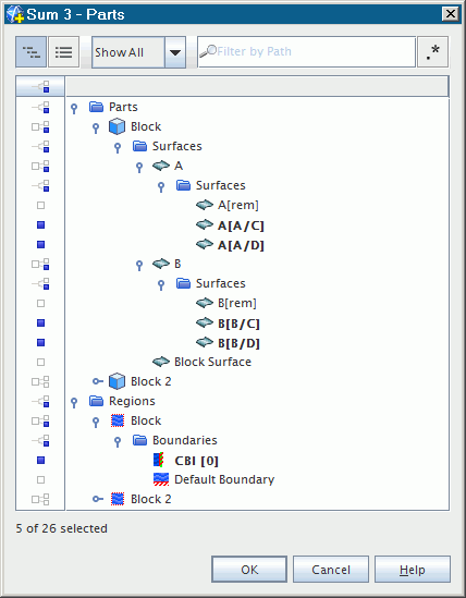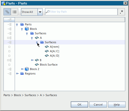 要访问接触的零部件表面的相交部分和剩余部分,展开相交父零部件表面的节点,并选择所需的子表面网格。 对于以下两种情况存在子表面网格:(a) 父零部件表面参与的每个接触和 (b) 不相交的父零部件表面的剩余部分。