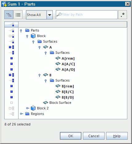 - 选择总零部件表面 A 和 B 及其所有零部件子表面网格(接触区域和剩余区域):
