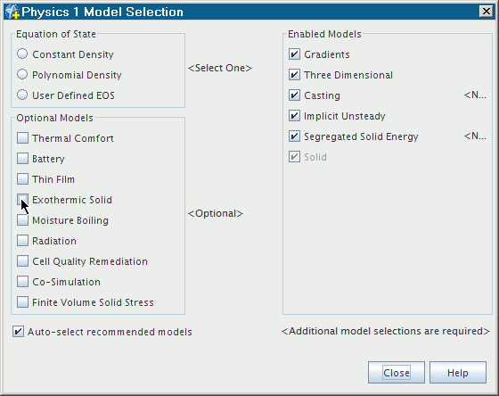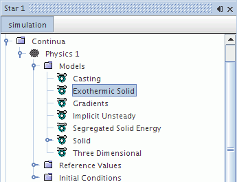 选择放热固体模型 要选择放热固体模型: 选择包括以下模型: 固体材料模型 分离固体能量模型 隐式非稳态时间模型 铸造可选模型 从可选模型组合框中选择放热固体模型。 关闭模型选择对话框时,放热固体模型将显示在连续体 > 物理 > 模型节点下的列表中。 该模型没有用户自定义的属性。