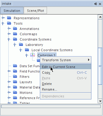 互动编辑局部坐标系 要以互动方式编辑局部坐标系: 如果具有活动的场景显示,则右键单击该场景显示,然后选择在当前场景中编辑。 如果场景显示未处于活动状态,将禁用(灰显)此弹出菜单项。 修改局部坐标系。 用于在场景中修改局部坐标系的后续步骤与用于创建局部坐标系的步骤相同。 请参见以互动方式创建局部坐标系