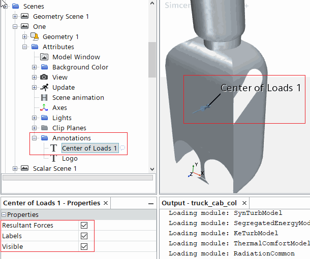 负载中心报告注释将场景中的负载中心位置显示为小球体,力矢量的方向显示为 3D 图形,且有报告标签显示为文本标签。