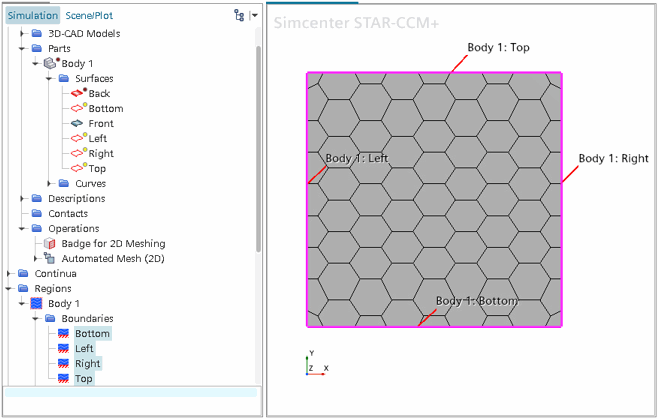 将对标记为 2D 的零部件进行网格化。所有标记为 2D 边界的零部件表面均会创建边界。这些边界在 2D 网格内显示为边。