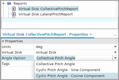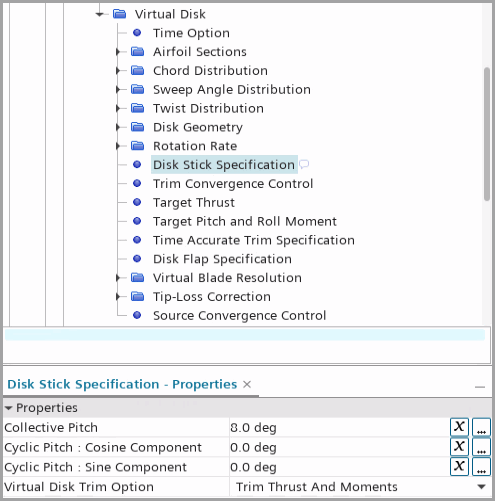 - Select the node, set the initial pitch angles and activate the Virtual Disk Trim Option with only thrust or with thrust and moments. See Disk Stick Specification.