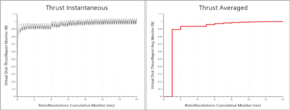 To visualize the solution, you are advised to create a single plot with the following reports with iteration as monitor trigger. See 报告虚拟盘体结果 and Virtual Disk Report Reference.- Virtual Disk Force report in the Z direction of the disk coordinate system for thrust (lift force).