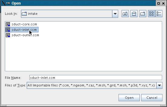 - 同时选择文件 sduct-inlet.ccm、sduct-core.ccm 和 sduct-outlet.ccm。