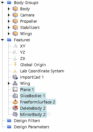 在 3D-CAD 视图 1 场景中,选择除稳定器根部附近的基本表面以外的所有面,如下所示: