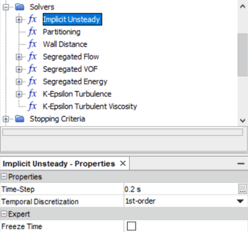 节点 属性 设置 隐式不定常 时间步 0.2 s 分离能量 流体亚松弛因子 0.5