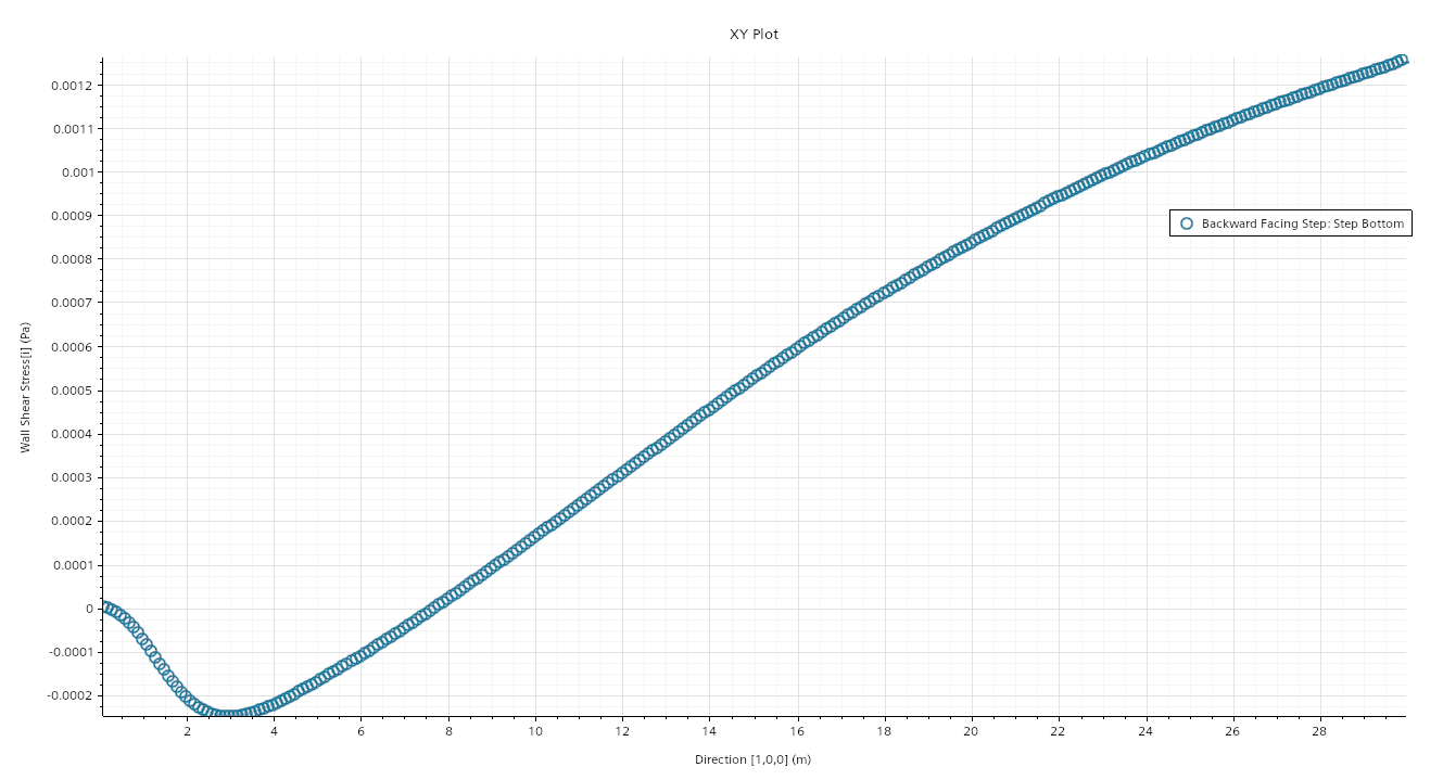 x 方向的壁面剪切应力从 0.0 Pa 稳步下降,在底部阶梯边界上方 3.0 m 处达到最小值约 -0.00025 Pa。这很可能是由于气流经过该阶梯后再循环区域而导致的。从 3.0 m 处向上,x 方向的壁面剪切应力稳步上升,在出口处达到峰值 0.00125 Pa。