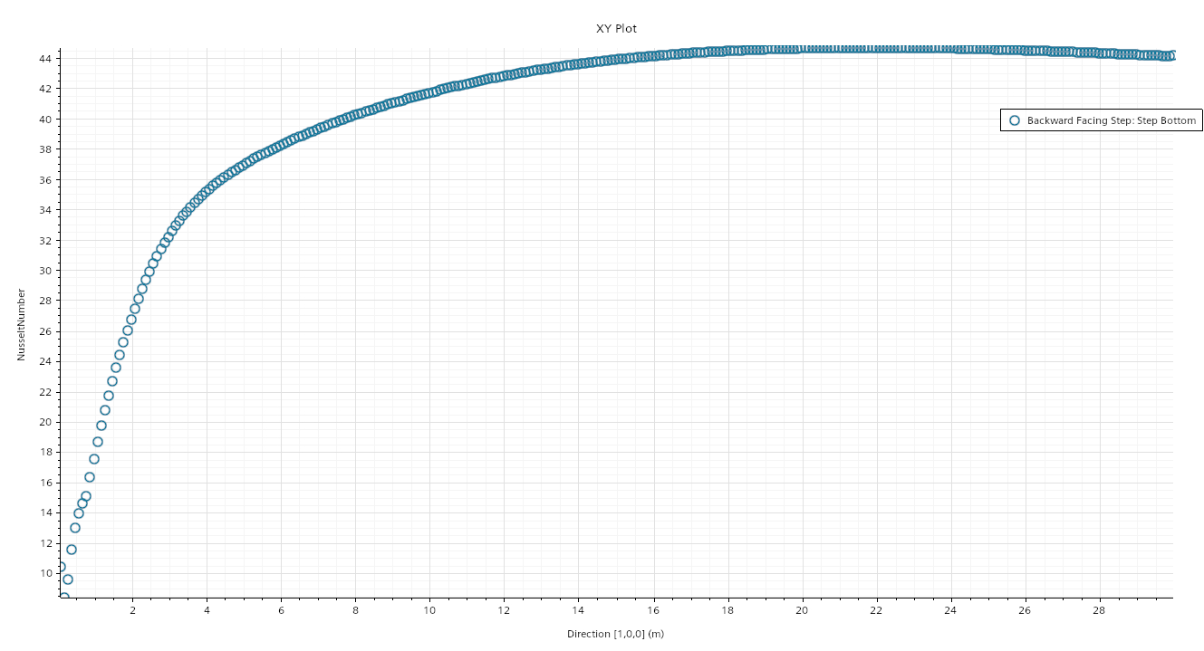随着阶梯底部被加热,努赛尔数在此表面上方(范围可高达 3.8 m)迅速增大。这是再循环区域。随着流体继续经过这一点,努赛尔数继续增大,但增大速率要慢得多,在出口处达到最大值约 44。