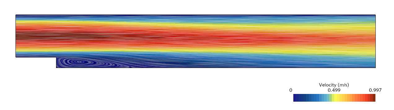 在后向阶梯的入口处,可以看到明显的抛物线速度分布,速度在通道中心线处达到最大值 0.997 m/s,而通道壁面处的速度幅值低得多。一旦流到达阶梯且流展开并分离,速度幅值将下降。在阶梯后面,再循环区域形成,与逼近流相比,此区域中的速度幅值明显较低。