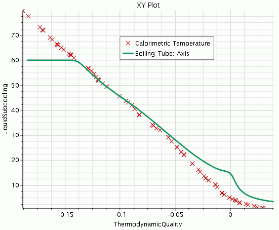 此处,正如预料的那样,在与零热力学特性线交叉时,流体过冷仍高于零。 热量将在壁面附近生成蒸汽,而不是加热液体核心。 Simcenter STAR-CCM+ 对此核心过冷做出的过度预测与出口蒸汽的过度预测一致。