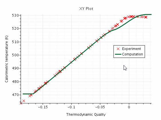 在产生蒸汽时,Simcenter STAR-CCM+ 结果偏离了这条线。 此结果正如热平衡所预期,因为如果蒸汽在过冷条件(热力学特性 < 0)下共存,则流体必定低于均质混合物可达到的温度。