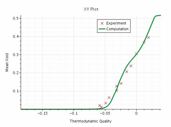 轴向空隙预测在净蒸汽产生的开始位置附近情况良好,通过最先的几个实验点,直到到达某个中间水平的空隙。 超过此中间水平,它在最后一个实验点处过大预测空隙约 20%。 可通过调整模型来改善一致性。 但更令人满意的是,这组模型和松弛因子可以将求解提供给 Bartolemei (1982) [972] 中指定的许多情形,而不需要做任何进一步调整。