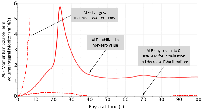- IF ALF stays equal to zero, decrease the value of EWA iterations. Additionally, initialize the flow field with turbulent perturbations using the Synthetic Eddy Method. See Setting Up Synthetic Eddy Method.