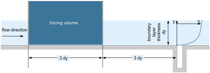 Example: To model the boundary layer flow over a cavity, you place the forcing volume about three local boundary layer thicknesses upstream of the cavity and size the forcing volume about three local boundary layer thicknesses long.