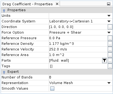 属性 值 单位 空 坐标系 方向 [1.0, 0.0, 0.0] 力选项 压力 + 剪切力 参考压力 0.0 Pa 参考密度 1.177 kg/m^3 参考速度 252.0 m/s 参考面积 1.0 m^2 零部件 [流体:壁面] 条带数 0 表示 体网格 平滑值 停用