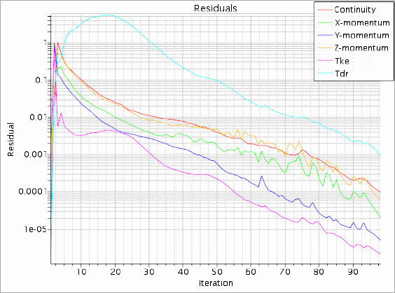输出窗口中会显示求解进度。可忽略输出窗口中有关平滑的警告信息。图形窗口中会自动创建残差屏幕,并在其中显示求解器的进度。
