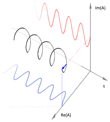 这两部分组合在一起描述了复平面中随时间变化的幅值的螺旋线。原始正弦曲线现为沿螺旋线的实部或虚部轴的投影。