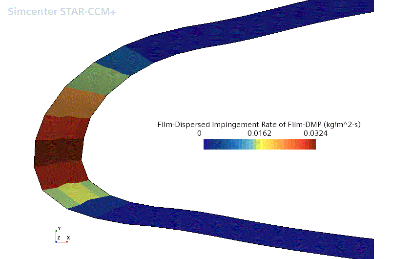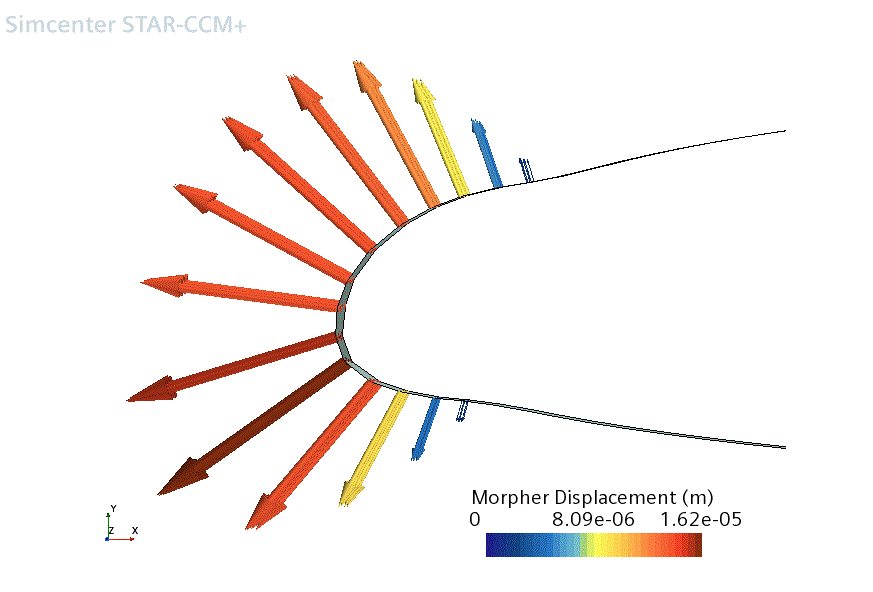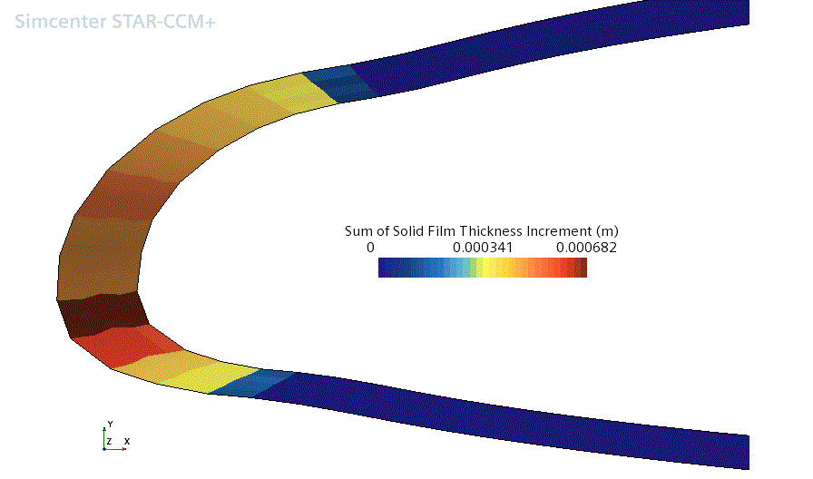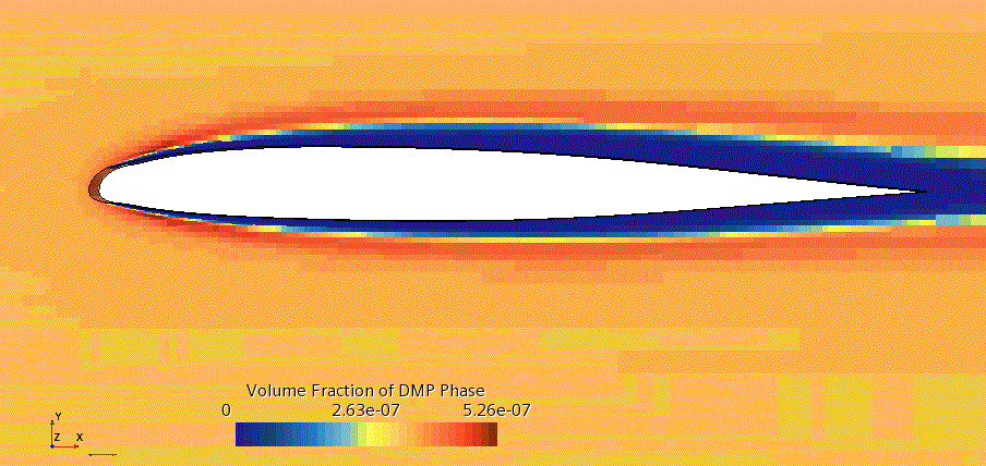可视化结果 检查您之前准备的场景。 撞击率场景显示水滴撞击翼型表面的速率: 变形在每个时间步使翼型表面发生的位移量显示于变形位移场景中: 空气中的水滴浓度显示于 DMP 体积分数场景中: 累积在翼型表面的冰的总量显示于总固体膜厚度增量场景中: