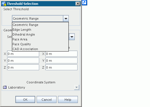 使用指定阈值进行选择 通过此工具,可使用阈值选择对话框在显示的表面上选择实体。过滤器选项控制工具选择的实体。使用阈值选择选项将打开阈值选择对话框,可在其中指定阈值并输入最小值和最大值。 以下各节介绍了各种阈值方法。